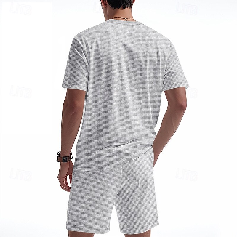 Men's Waffle Shirt T-shirt Suits 2 Pieces Outfits Tee & Shorts Short Sleeve V Neck Summer Plain Fashion Casual Lace up 2 Piece Vacation Daily Wear Going out Black White Royal Blue Top Tee for Men 24