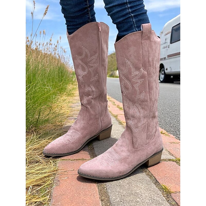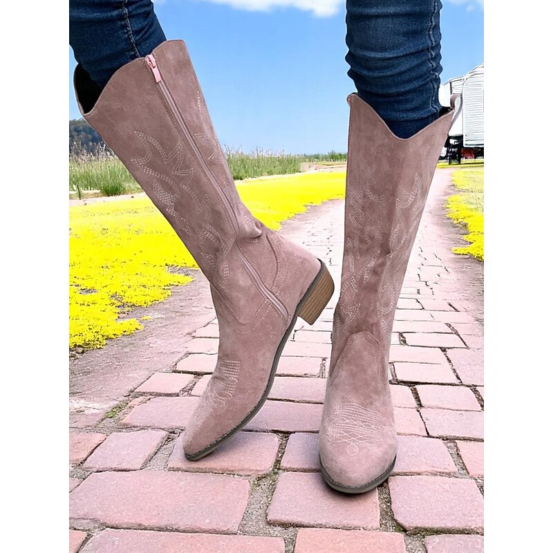 HOT ! Women's Western Suede Knee High Cowboy Boots – Embroidered Tan Pointed Toe Mid Heel Riding Boots for Country Concerts, Fall Outfits, and Outdoor Events