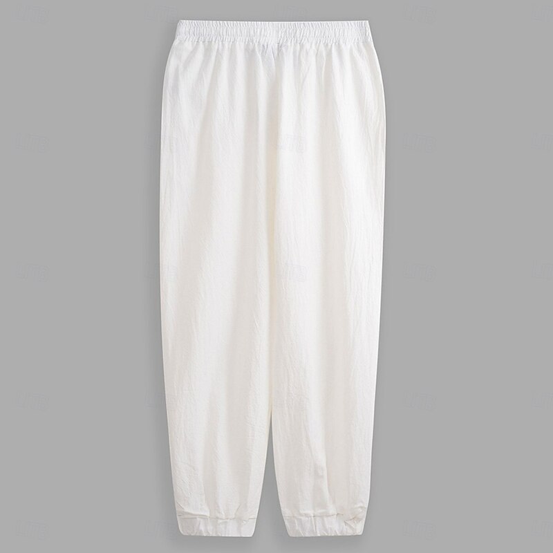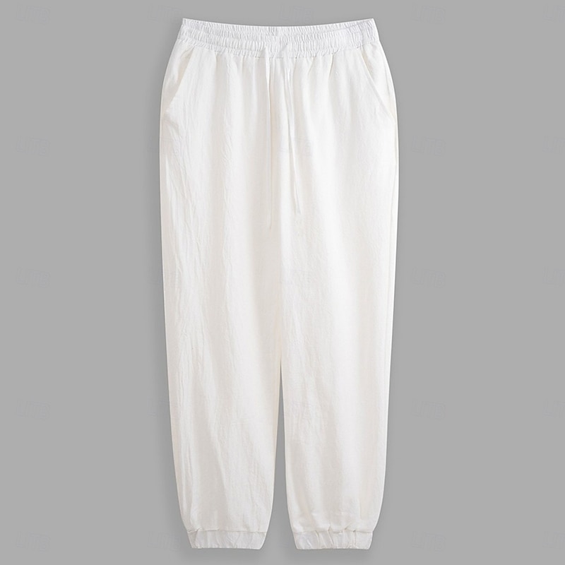 Men's Linen Pants Trousers Summer Pants Jogger Pants Elastic Waist Straight Leg High Rise Solid Color Plain Comfort Breathable Full Length Wedding Holiday Vacation Fashion Black White High Waist 11