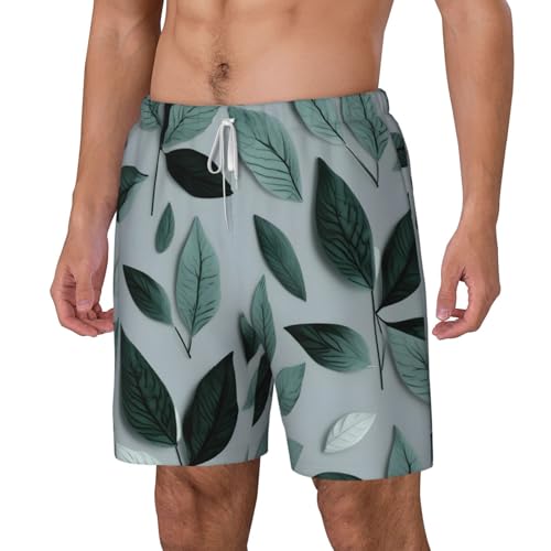 HOT ! Men's Mint Gray Leaf Print Quick-Dry Mesh Swim Trunks Stretch Lining Beach Shorts Surfing Summer Vacations