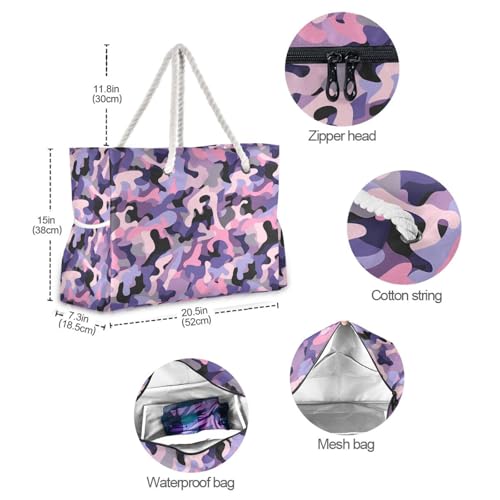 Camouflage Purple Peach Portable Bag For Women with side pocketes Bags For Traveling for Pool Gym Grocery Travel 6