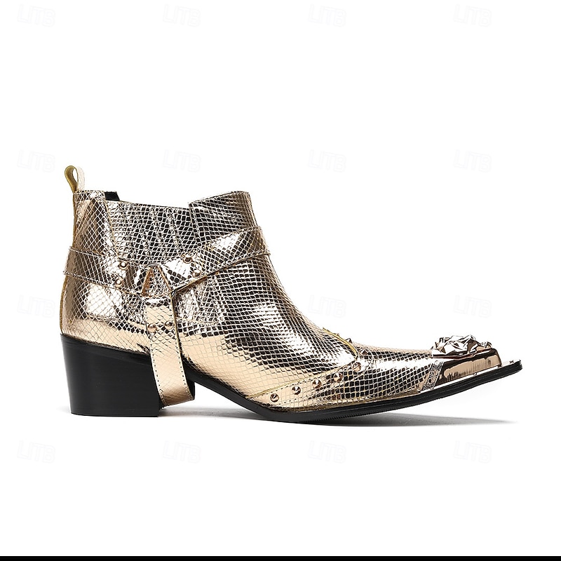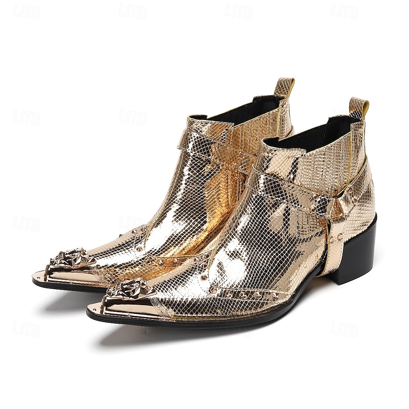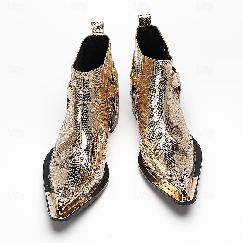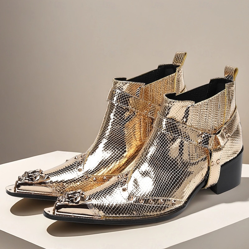 Men's Premium Cowhide Gold Croc Embossed Leather Chelsea Boots, Fashion Motorcycle Dress Boots for Biker Style, Concerts, Nightlife and Special Events 2