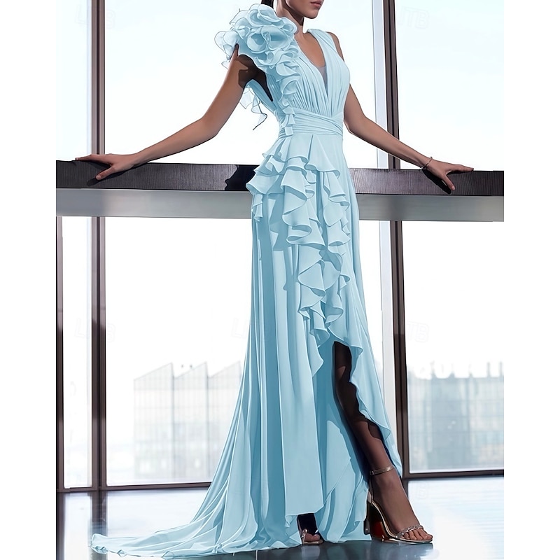 A-Line Evening Gown Floral Dress Formal Prom Court Train Sleeveless V Neck Fall Wedding Guest Chiffon with Ruffles Shouder Flower