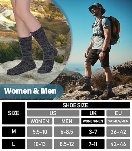 • Thermal Composition : LANLEO hiking socks for women and men are made of 70% merino wool, 23% polyester, 5% spandex, 2% nylon. Men women merino wool socks has better temperature regulation functional and perfect companion for chilly days,ensuring toasty feet in any cold weather