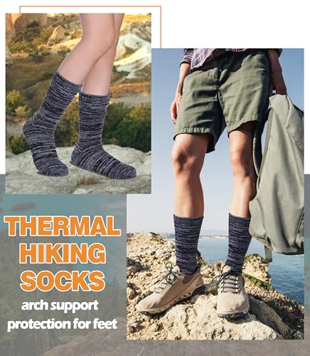 • Protection for Feet : These mens womens wool thermal socks have arch support ,which can improve the blood circulation and keep socks fit snugly. Cushion foot absorbs shock and reduces risk of blister. Extra thick wool socks can greatly improve your comfort in hiking , running , walking , climbing , camping, skiing, trekking, working, hunting or everyday wear, ensuring every step is comfortable
