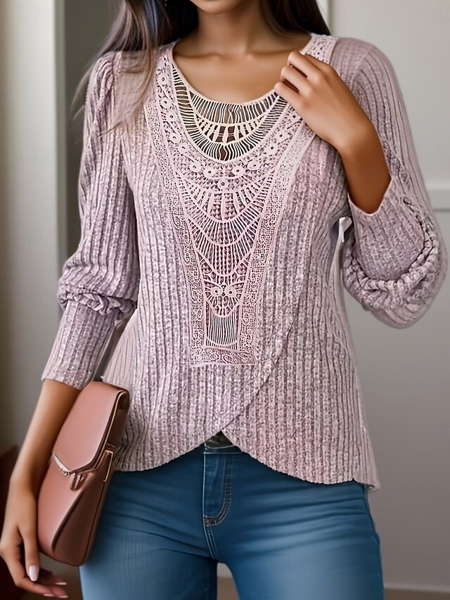 HOT ! Women's Lace Shirt Solid Color Stylish Casual Long Sleeve Crew Neck Regular Tops Daily Lace Patchwork Pink Blue Gray Summer Spring Fall