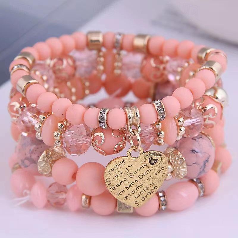 : The bracelet set features an array of colorful beads in different shapes and sizes, creating a lively and playful look. A standout piece is the golden heart-shaped pendant, adorned with engraved text, which adds an extra layer of charm and personality to the accessory.