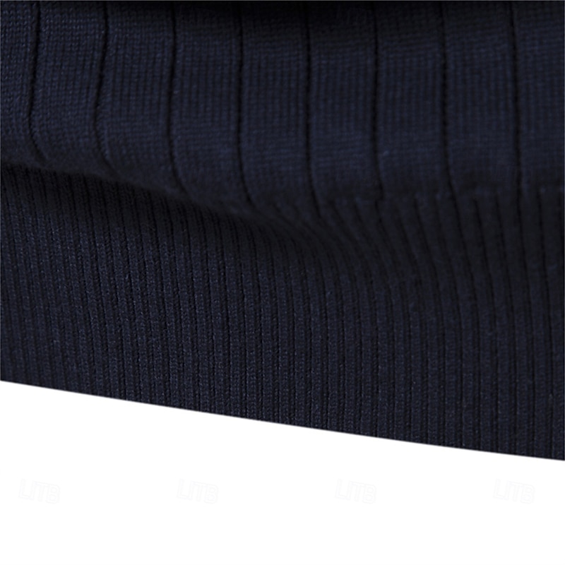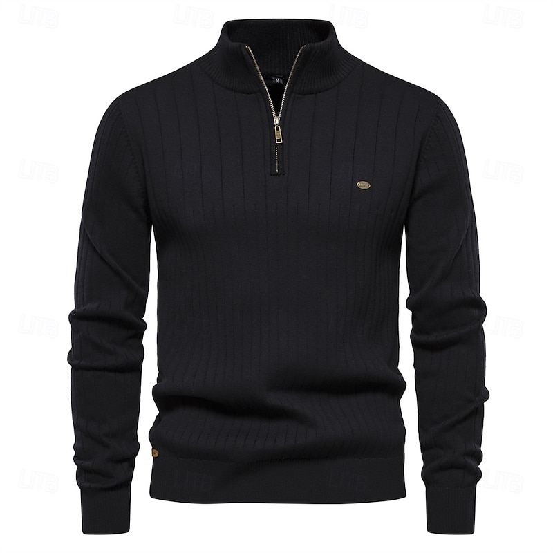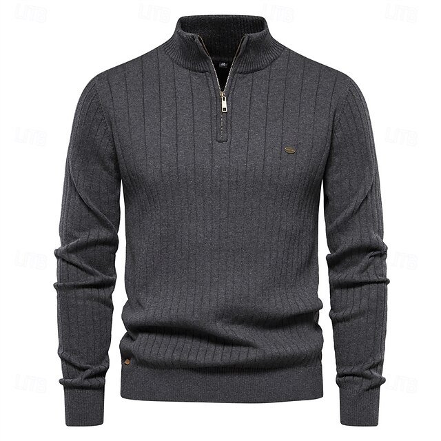 Featuring a modern quarter-zip neckline, this sweater offers adjustable ventilation and a contemporary style. The ribbed texture adds a classic touch, while the regular top length maintains a clean and sophisticated look. Available in solid colors like Brown, Black, Dark Navy, Dark Grey, and Khaki, it provides versatile styling options.