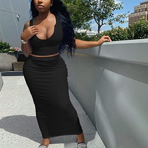 Women Sexy Two Piece Skirt Outfits Long Sleeve/Sleeveless V Neck Bodycon Ribbed Knitted Maxi Club Party Dress 2