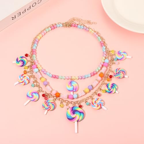 HOT ! Lollipop Candy Layered Necklaces for Women Novelty Colorful Crystal Beads Sweet Candy Lollipop Cake Pendant Choker Necklace Cute Funny Birthday Halloween Holiday Party Jewelry Gift