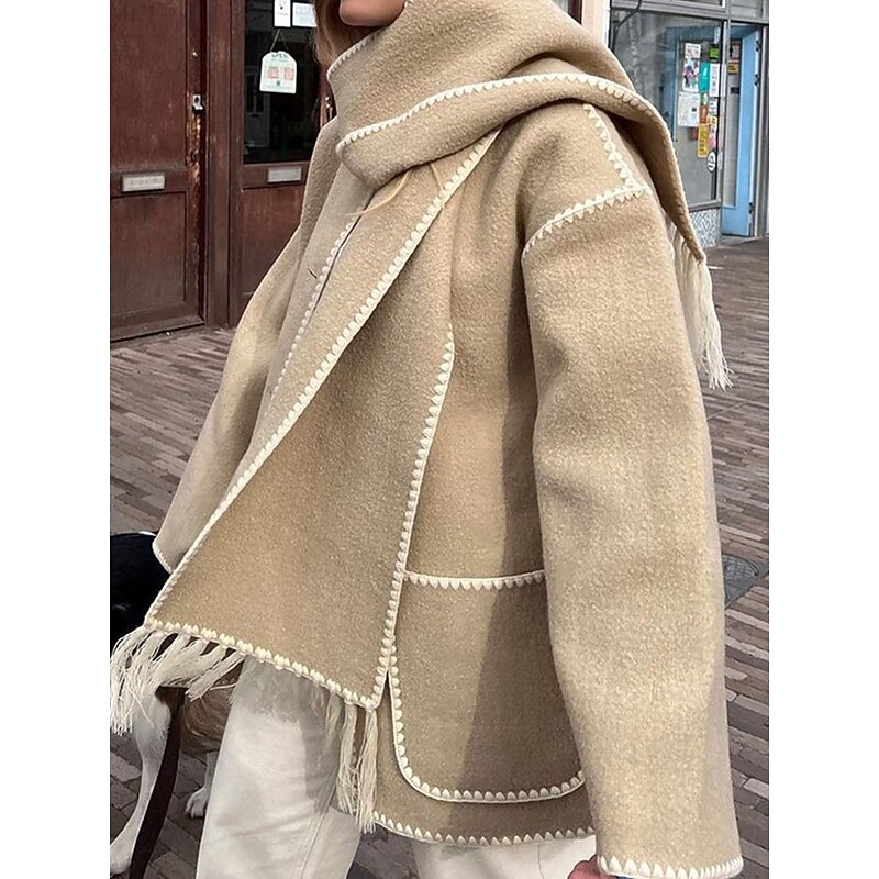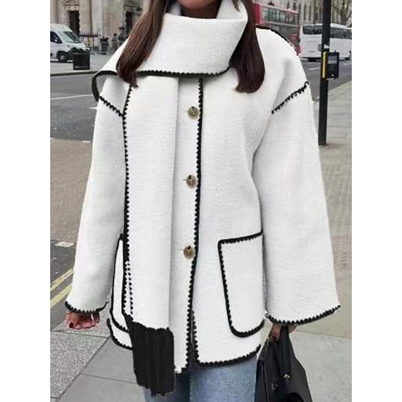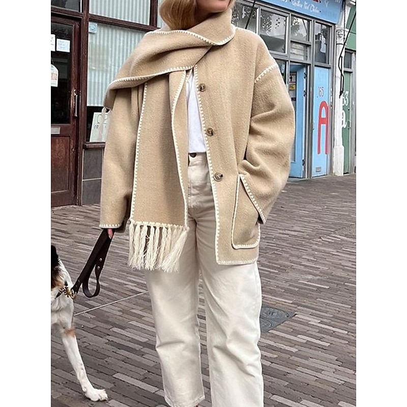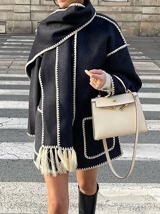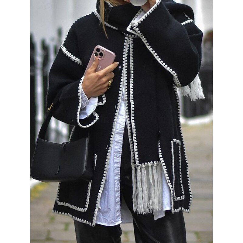 Highlights [Fabric] : Crafted from a high-quality polyester wool blend, this women's winter coat is designed to provide thermal warmth and comfort while remaining breathable and stylish. The fabric ensures durability and is perfect for everyday wear during the fall and winter seasons. [Fit] : The coat offers a regular fit with a touch of micro-elasticity, making it easy to layer over various outfits. Its loose silhouette is perfect for a casual yet sophisticated look. [Design Highlights] : This chic coat stands out with its elegant tassel fringe along the hem, adding flair and modern sophistication to the design. The contrasting white stitching on a dark solid background adds a unique and striking visual element. The coat features a single-breasted placket, crew neckline, and large, practical pockets, combining style and functionality. [Occasions] : Ideal for daily wear, street outings, or outdoor activities, this coat effortlessly elevates any ensemble. Whether you're on a city stroll or attending an outdoor gathering, this coat is a stylish and versatile choice for the colder months. [Size Range] : Available in sizes S, M, L, and XL, this coat caters to a wide range of body types, ensuring a comfortable and flattering fit for everyone.