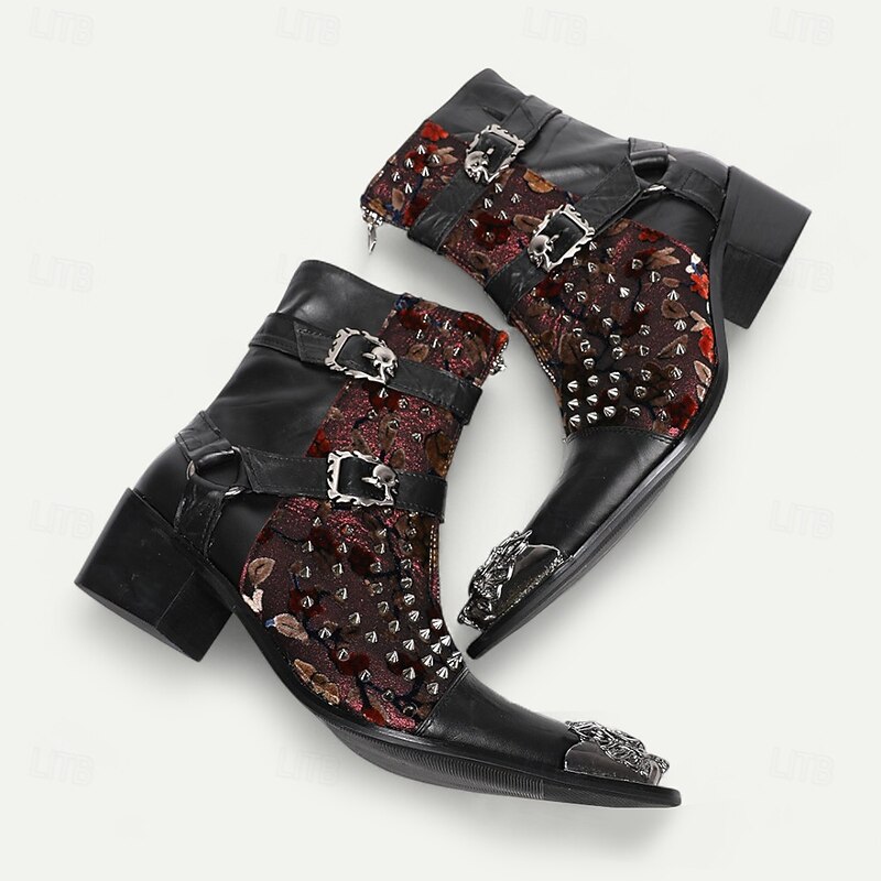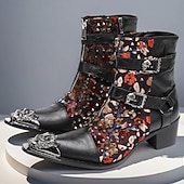 More information about Men's Black Floral Embroidered Ankle Boots – Genuine Leather Western Cowboy Style with Buckle Straps for Parties, Stage Performances and Nightlife
