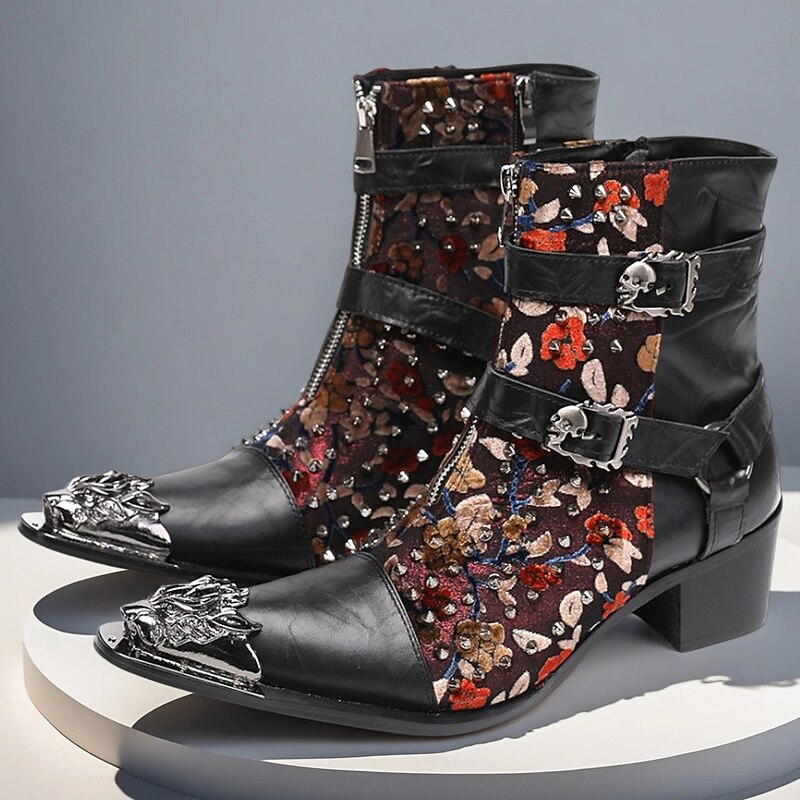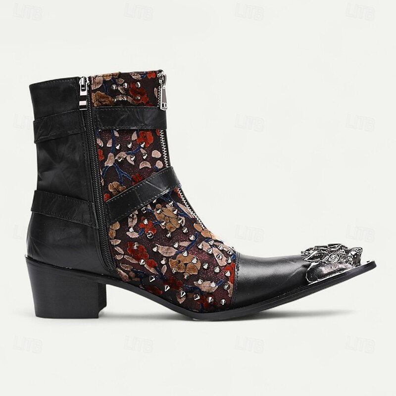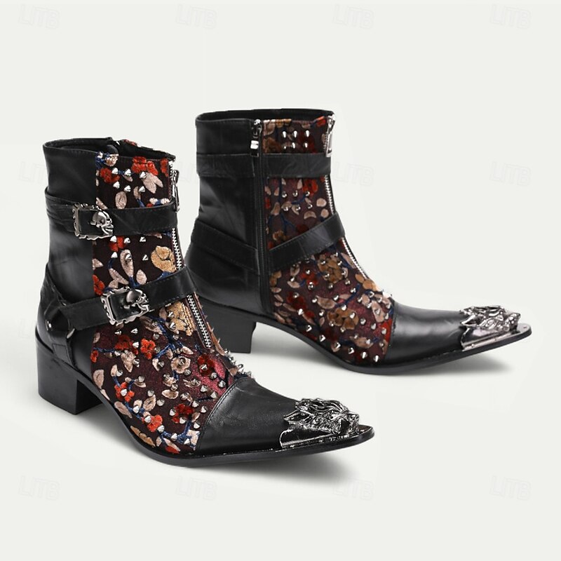 Men's Black Floral Embroidered Ankle Boots – Genuine Leather Western Cowboy Style with Buckle Straps for Parties, Stage Performances and Nightlife 1