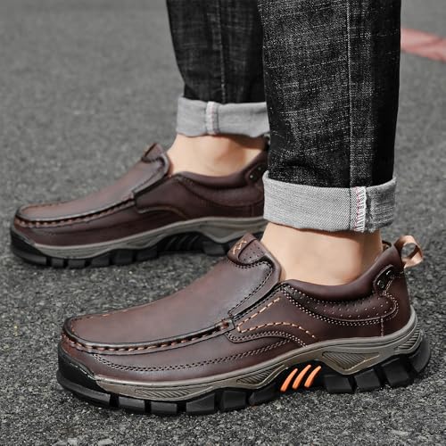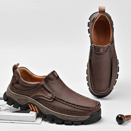 Outer material: LeatherClosure type: Pull-OnFOLDING RESISTANT PU UPPER: first-class PU upper, strong and folding resistant, breathable and snug, one-piece molding to fit the foot, hand-stitched reinforced sole, non-degumming and more foot careRELIEF FROM FOOT PAIN: The roomy toe placement and extra-deep design provides a comfortable, non-restrictive fit on the front part of the foot and toes, relieving pressure on bunions, hammertoes, Morton's neuromas, and swollen feetNON-SLIP OUTSOLE: The sole of these men's comfortable slip on loafers is made of a durable rubber material that greatly reduces shock from impact and is slip-resistant; Whether you're walking on a rainy day or navigating busy city streets, these loafers will keep you steady and confident with every stepEASY SLIP-ON DESIGN: Achieve style and comfort with ease in the men's orthopedic comfortable casual leather slip on loafers; With no bending over or struggling to tie laces, these easy slip-ons offer a hassle-free footwear solutionAPPLICABLE OCCASIONS : Suitable for indoor and outdoor activities in any season; For daily walks, attending parties, walking the dog, going to the grocery store, these men's orthopedic slip on loafers are the ideal combination of comfort and style, as well as a thoughtful gift for Christmas, Father's Day, Thanksgiving and other holidays Perfect for everyday use. High quality materials and excellent craftsmanship ensure long-lasting durability.