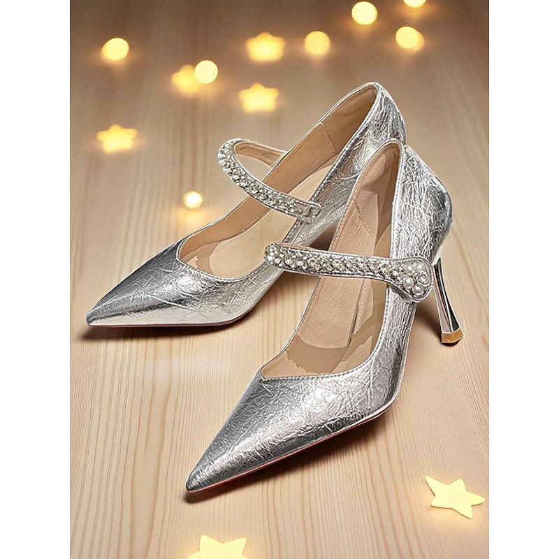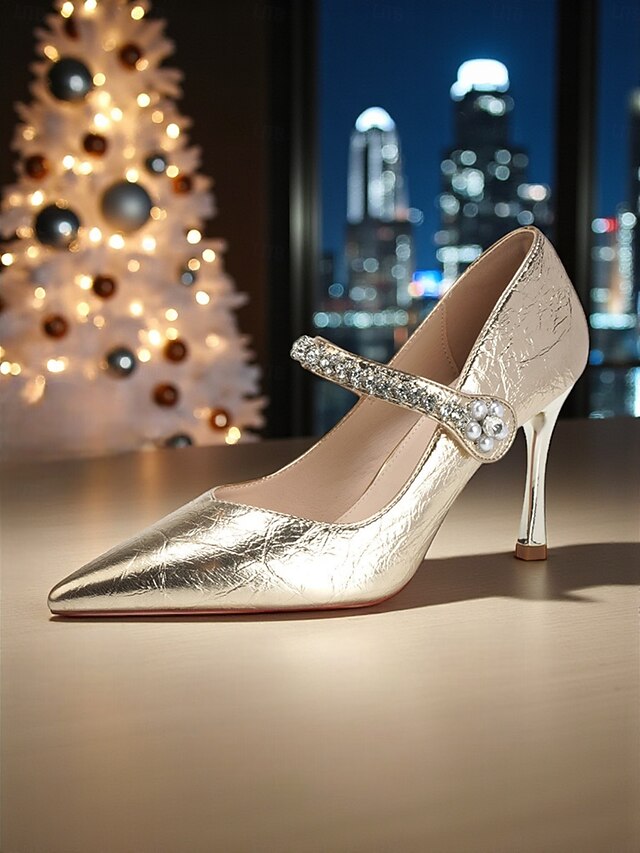HOT ! Women's Gold Metallic High Heel Pumps - Pointed Toe Dress Shoes with Pearl Rhinestone Strap for Formal Occasions & Christmas Parties