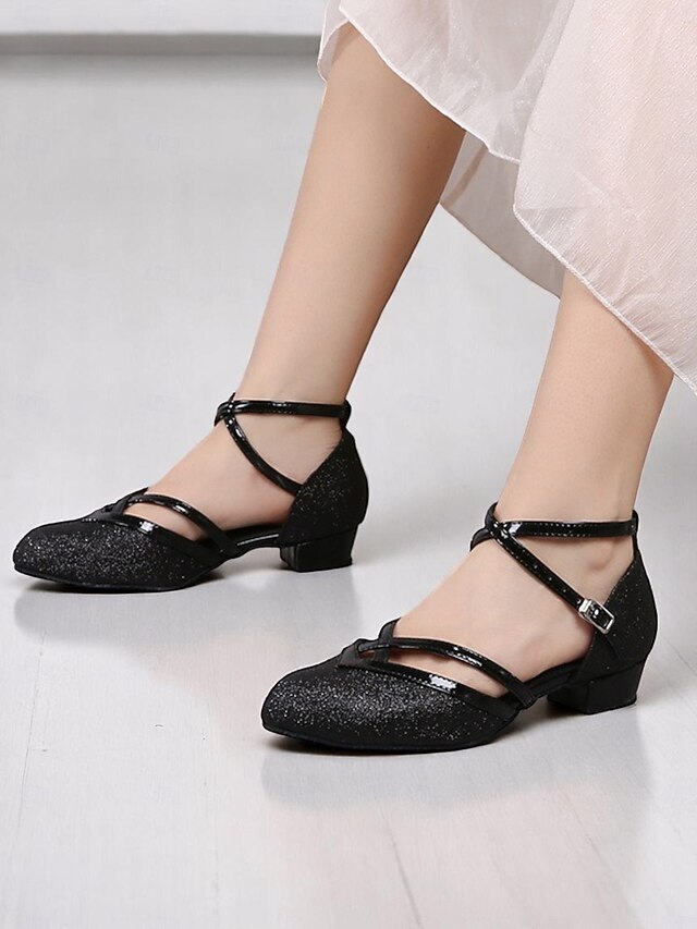 HOT ! Women's Black Glitter Low Heel Dance Shoes – Sparkly Ankle Strap Ballroom Shoes for Girls & Ladies' Performance or Practice