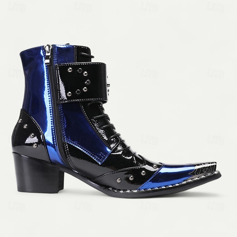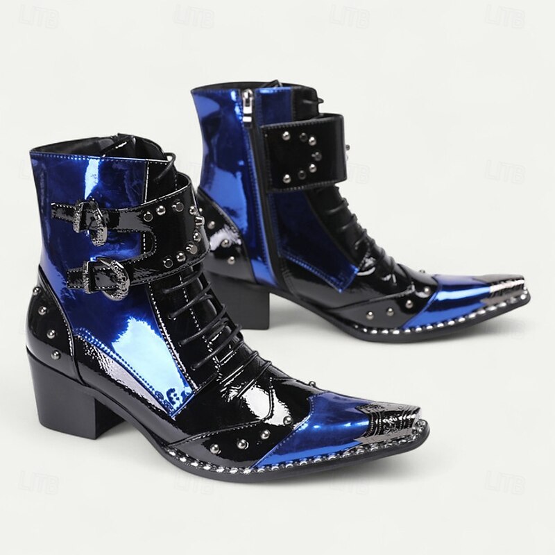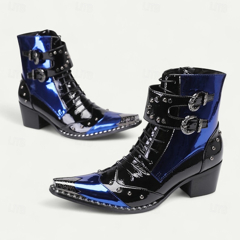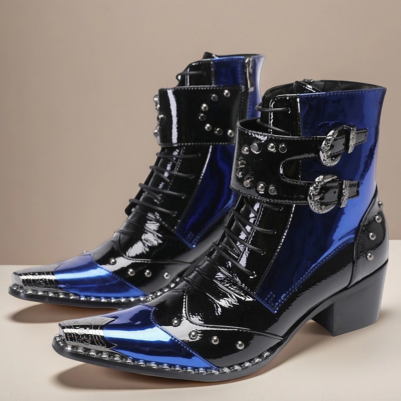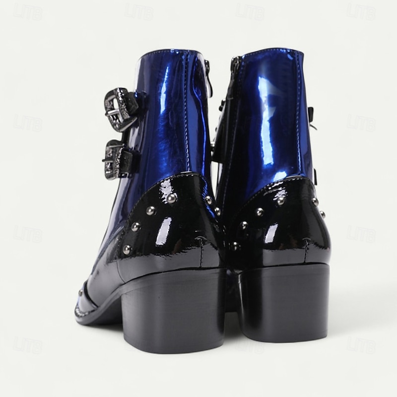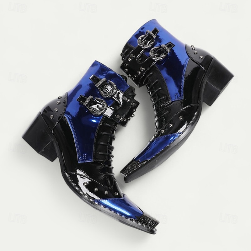 Men's Blue Patent Leather Gothic Ankle Boots with Buckle Straps – Punk Rock Stage Performance & Nightlife Party Shoes 1