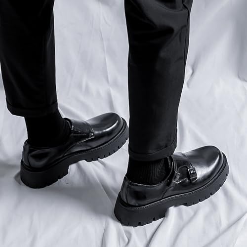 Men's Black Leather Platform Oxfords - Low Top Slip On Double Monk Strap Dress Shoes - Comfort Non-Slip, for Business Party Daily Wear 6