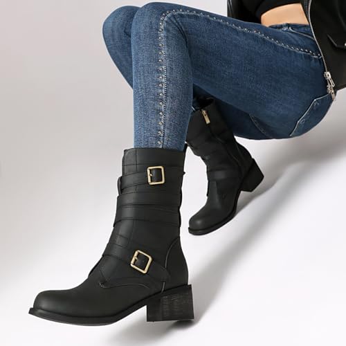 Women's Belt Buckle Mid Calf Boot,Retro Square Toe Chunky Heel Ankle High Shaft Boots,Women's Motorcycle Boots with Side Zipper Buckle Wrap Up Riding Boots. 6