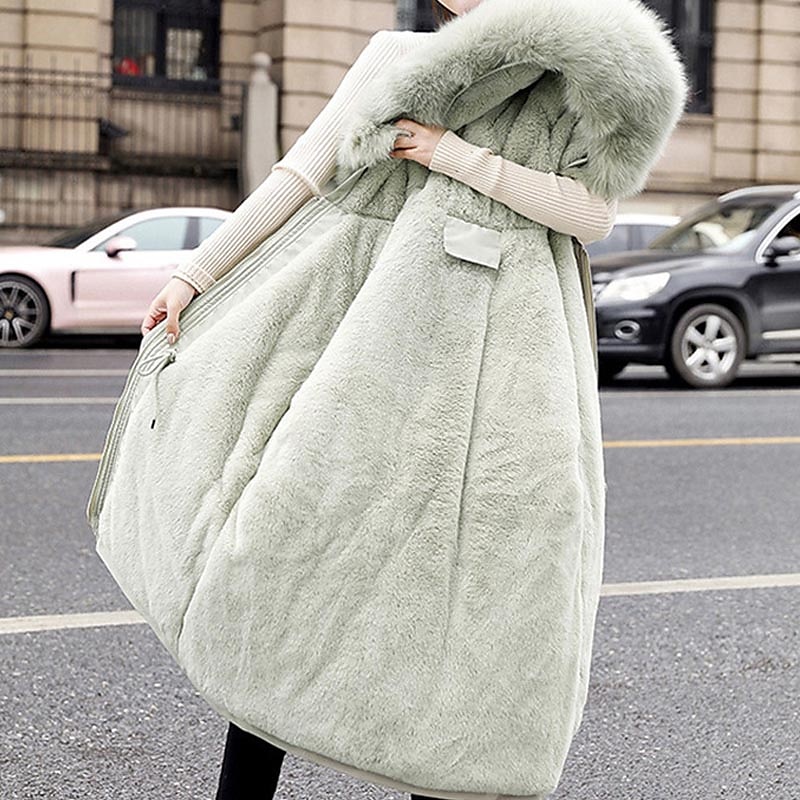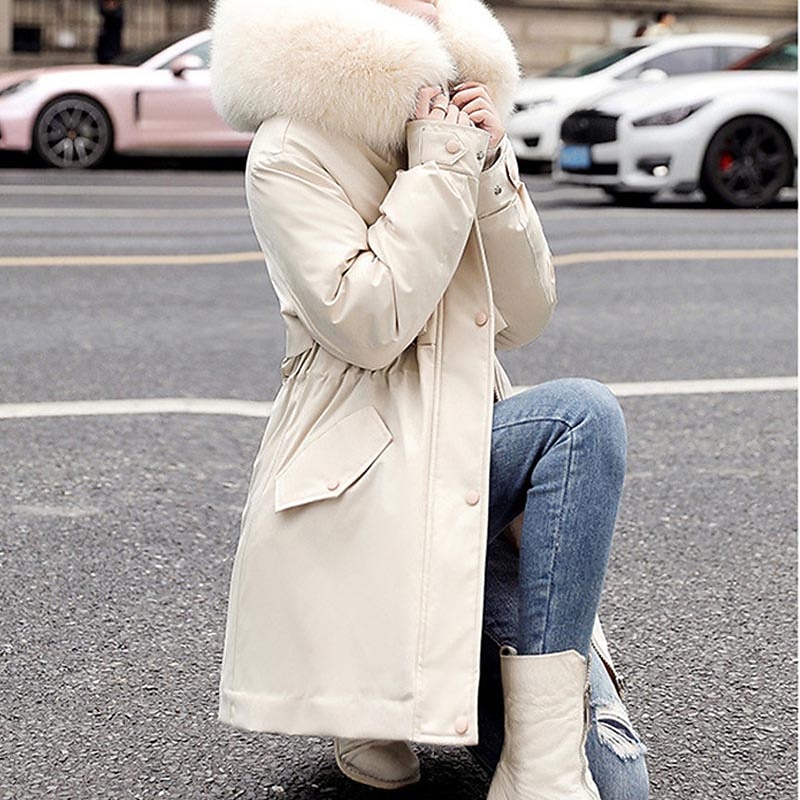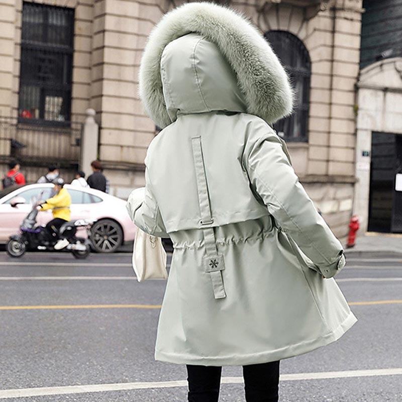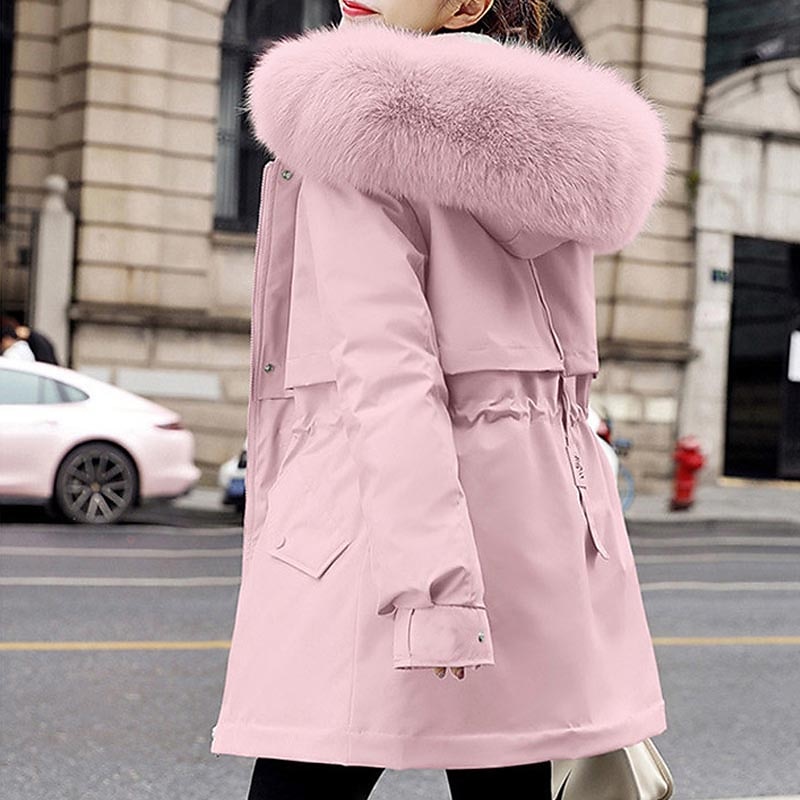 This winter jacket is equipped with a plush faux fur lining that extends into the hood, providing extra warmth and a touch of luxury. The detachable faux fur trim on the hood adds an element of glamour, while the full front zipper closure, complemented by snap buttons, offers superior protection against the wind. Two spacious front pockets add to its practical design.