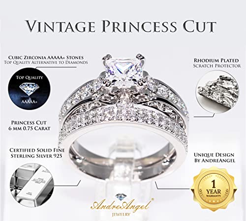 AndreAngel Engagement Ring Set for Women 2 pcs, Princess Cut 0.75 Carat, Solid Sterling Silver 925, 50 Cubic Zirconia Stones High Grade AAAAA+ 1