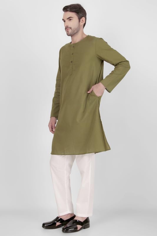 Mens Indian Casual Cotton Kurta Pajama Set - Olive - Crew Neck 5
