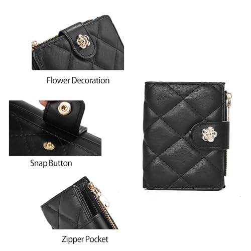 Small Wallet for Women Floral Snap Slim Quilted Faux Leather Zip Coin Purse & Card Holder - Black 5