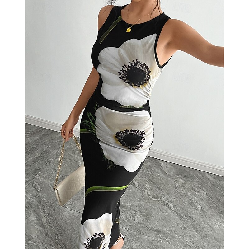 HOT ! Women's Midi Dress Floral Dress Print Dress Fashion Modern Outdoor Holiday Going out Regular Fit Flower Sleeveless Crew Neck Black Fall