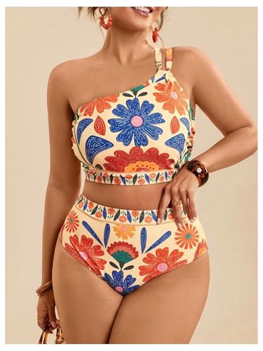 SOLY HUX Plus Size Bikini Sets for Women Floral Print One Shoulder High Waisted Bathing Suit Two Piece Swimsuit 2
