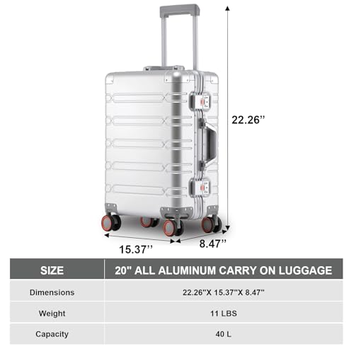 YYW entire-Aluminum Carry-On Luggage, Reinforced Metal Corners for Business Travel, Carry it with one hand, Silent Wheels with Smooth Ride (All aluminum 60 [silver],20inch-35x23x55cm)