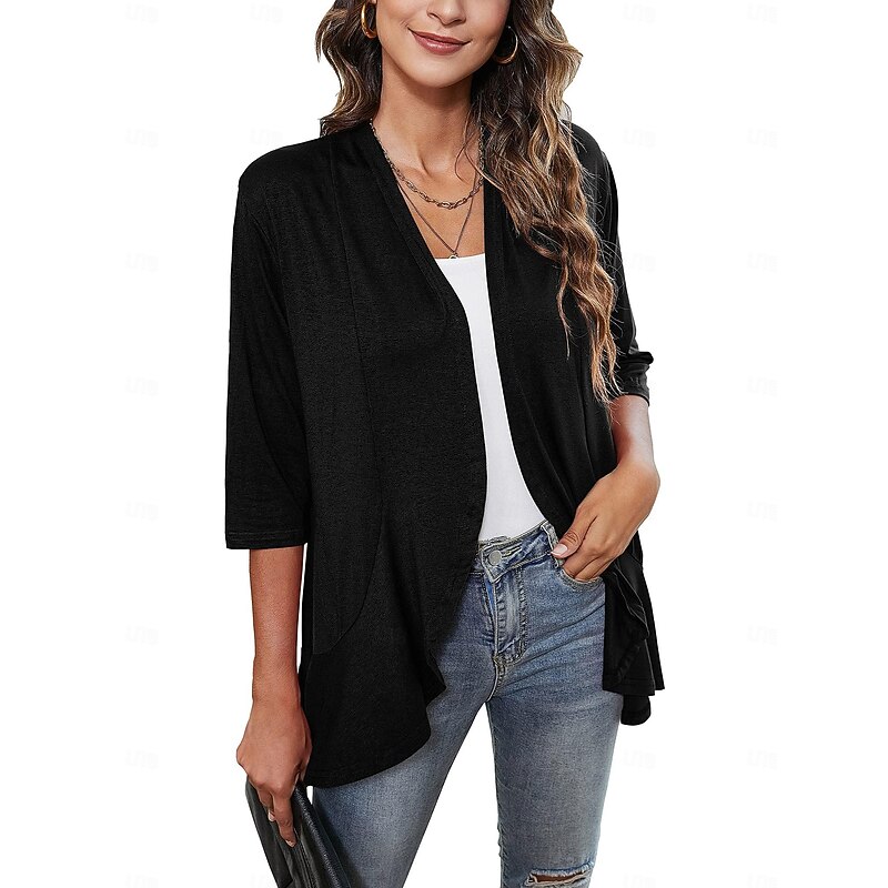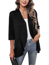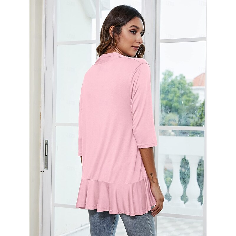 Highlights [Fabric and Fit] : This women's blouse is made from a combination of versatile spandex, polyester, and rayon, offering a soft texture and micro-elasticity for comfort. The blouse is designed with a flattering form fit, creating an elegant silhouette suitable for various body types. [Design Highlights] : Featuring a chic open-front style, this ruffle cardigan flows gracefully with a draped hem. The V-neck and three-quarter length sleeves add a modern touch, while the solid color pattern enhances its timeless elegance. [Occasions] : Perfect for work settings and daily wear, this stylish blouse can easily transition from professional to casual environments. Pair it with jeans or skirts for a sophisticated look suitable for spring, summer, and fall seasons. [Sizes Available] : Available in a range of sizes from S to 2XL, this blouse ensures a fit for various preferences, accommodating a wide audience. Overall, this blouse combines a stylish, modern design with practical comfort, making it an ideal choice for enhancing your everyday wardrobe.