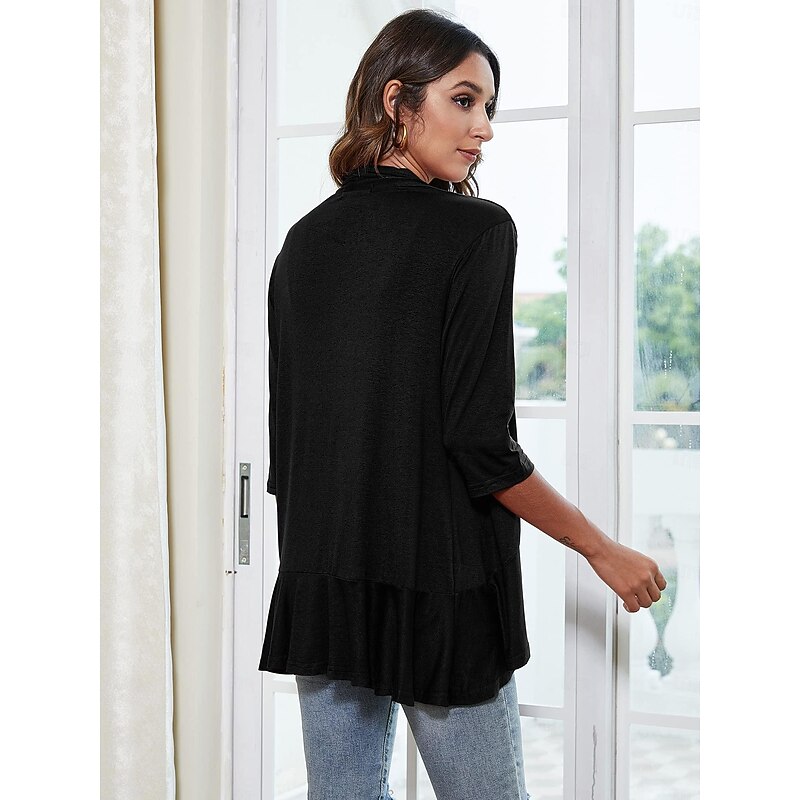 Women's Blouse Ruffle Cardigan Work Elegant Stylish Modern 3/4 Length Sleeve Black Summer Spring 14