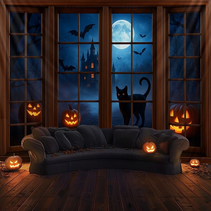 HOT ! Halloween Window Scene Wall Tapestry Backdrop – Creepy Skeleton in Top Hat Outside Gothic Mansion Window with Full Moon, Pumpkins, and Bats, Spooky Indoor Party 2025 Halloween Decoration