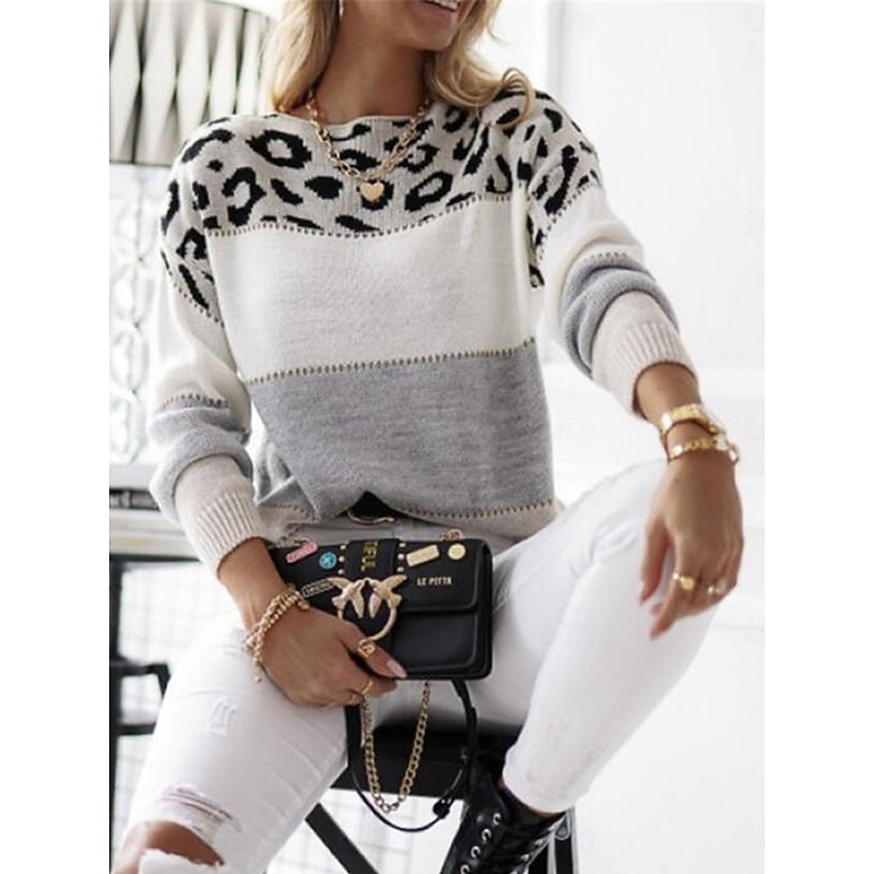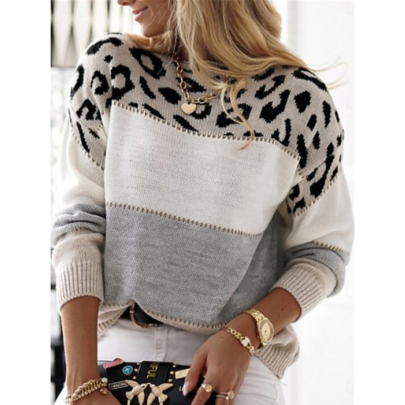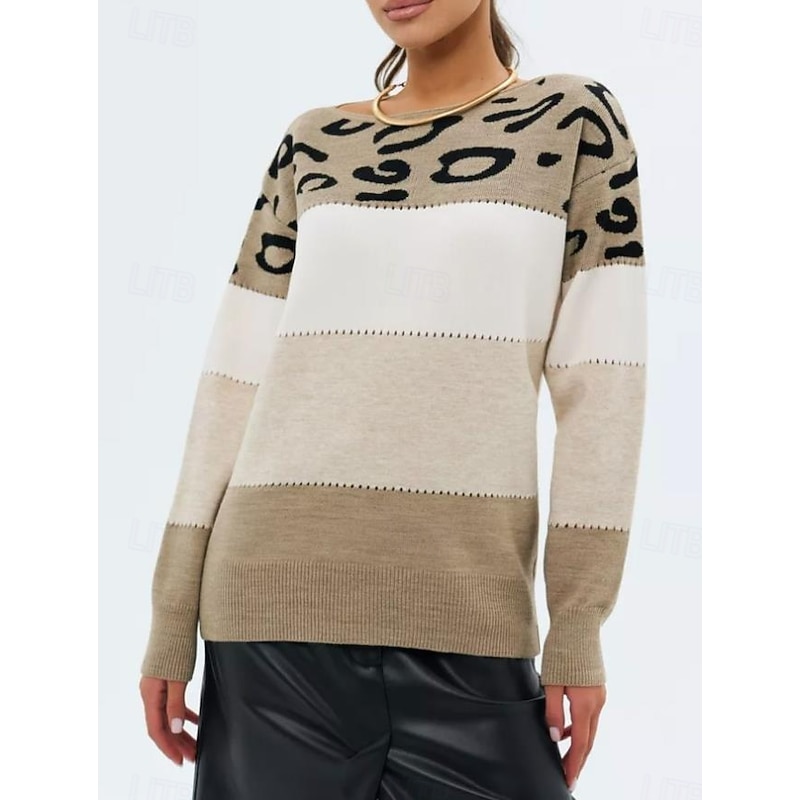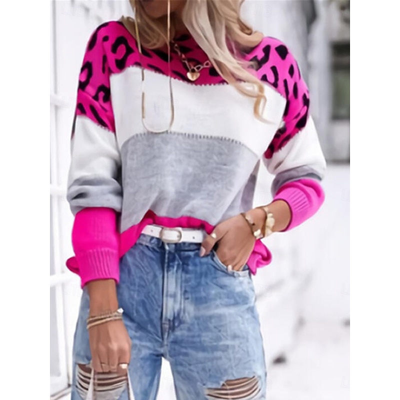 Highlights [Fabric & Material] : Crafted from high-quality polyester, this women's sweater boasts a soft and cozy feel, perfect for keeping warm during the fall and winter months. The ribbed knit design enhances its micro-elastic properties, ensuring comfort and a great fit. [Fit & Silhouette] : Featuring a relaxed, loose fit, this sweater provides a perfect balance between comfort and style. The crew neck and long sleeves with ribbed cuffs add a classic touch, making it versatile for various casual occasions. [Design Highlights] : The upper section of the sweater showcases a bold leopard print in shades of gray and black, complemented by wide stripes of white, pink, and light gray below. This playful mix of patterns makes it a standout piece in any wardrobe. [Occasions] : Ideal for daily wear, outdoor activities, or weekend gatherings, this sweater effortlessly combines fashion and functionality. Pair it with jeans or skirts for a chic look, whether you're at a casual outing or enjoying a cozy day at home. [Size Range] : Available in a variety of sizes from S to 2XL, this sweater ensures a comfortable fit for different body types, making it an essential addition to your seasonal wardrobe.