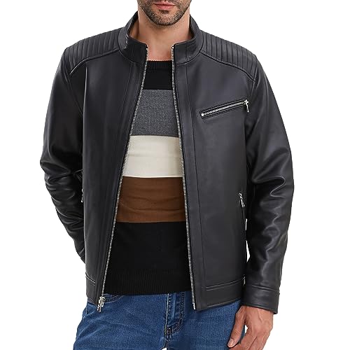 Leather Jacket Men,Lambskin Motorcycle Jacket, Black, Quilted Shoulders, Full Zip Front with Multiple Pockets 1