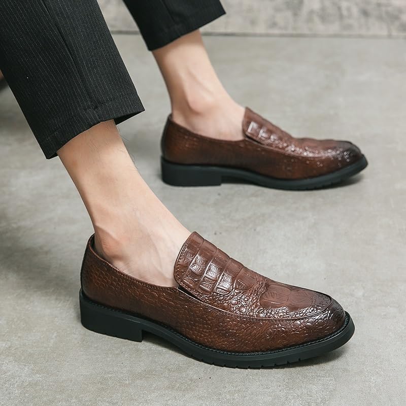 Why Choose Dress Shoes for Men Slip On Round Burnished Toe Crocodile Print Apron Toe Block Heel Anti-Slip Rubber Sole Low Top Non Slip Outdoor(Brown,9)?
