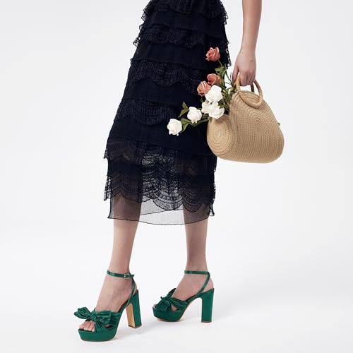 Elisabet Tang Vintage Bow Strappy Platform Chunky Block Heels Satin Bowknot Round Toe Sandals 4 inch for Evening Prom Comfortable 5