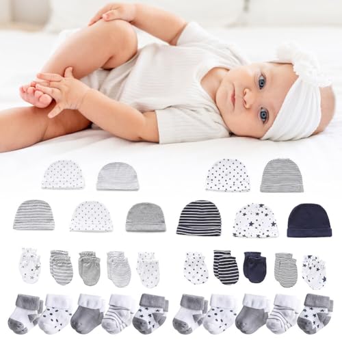 15 Pieces Newborn Cap Mitten Sock, Newborn Hats, Baby Mittens Gloves Infant Socks for 0-6 Months Unisex Baby Boys Girls, Type 2 4