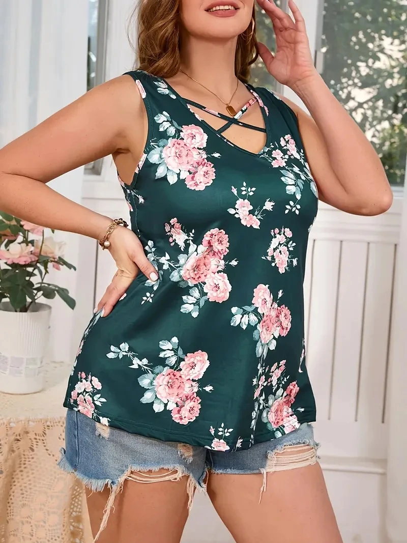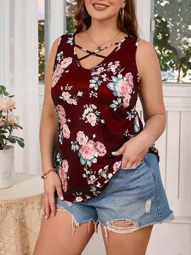 Plus Size Floral Print V-Neck Vest Tank, Soft Slight Stretch Polyester Fabric, Cross Front Detail.