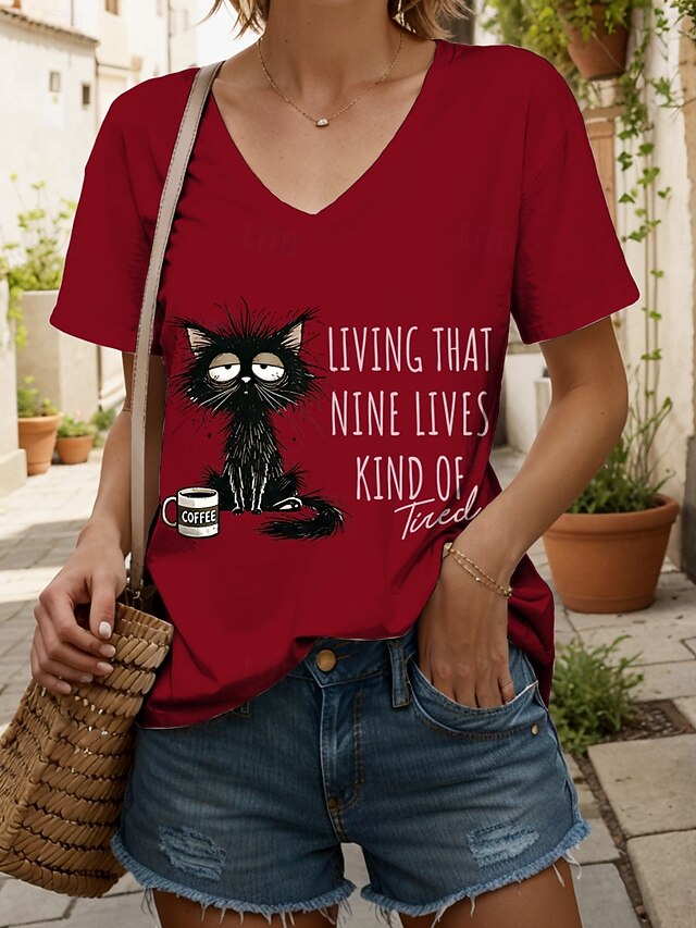 More information about Women's T Shirt Graphic Animal Cat Vintage Stylish Classic Short Sleeve V Neck Regular Tops Daily Print Black White Pink Red Blue Summer Spring
