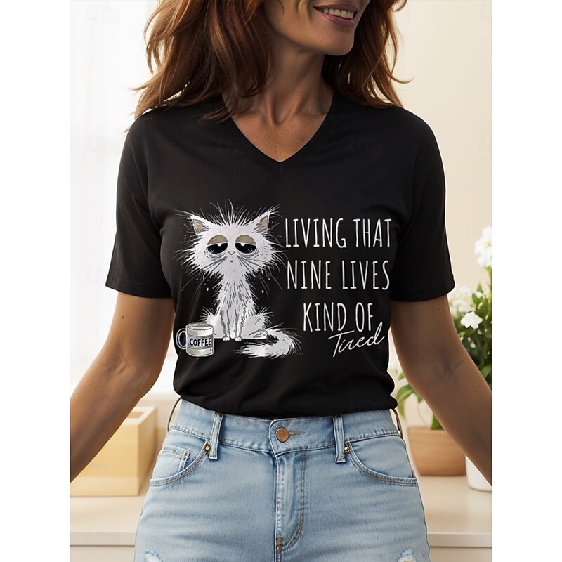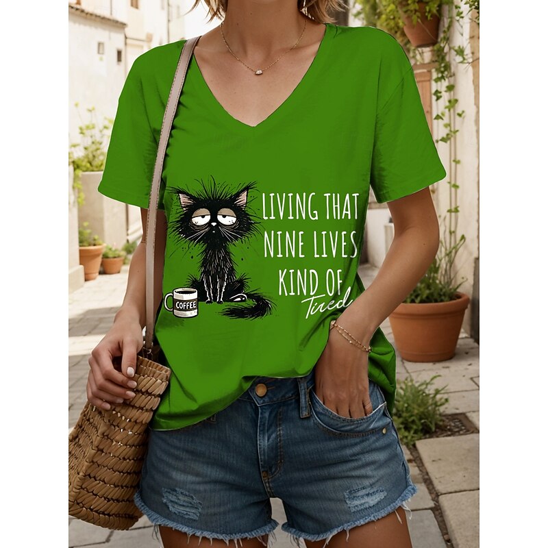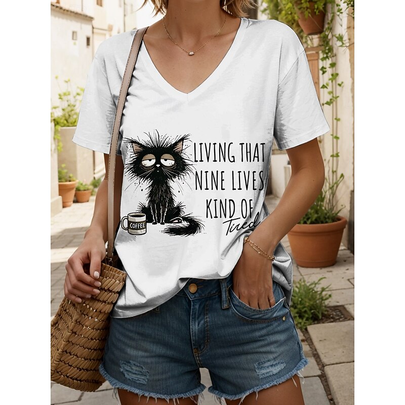 Women's T Shirt Graphic Animal Cat Vintage Stylish Classic Short Sleeve V Neck Regular Tops Daily Print Black White Pink Red Blue Summer Spring 15
