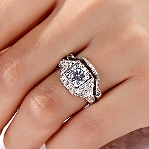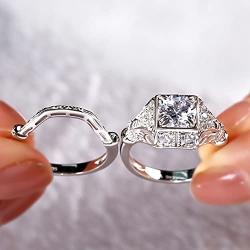 • 【Classical Design】:With touches of old and new, this vintage-inspired ring is certain to be cherished. Crafted in sterling silver, this unique look features a round cut center stone wrapped in an princess-shaped frame flanked by five stones each side. The scrollwork with intricate milgrain detailing line the sides of the shank and the matching band. Polished to a brilliant shine, this ring is a beautiful beginning to your lasting love story.