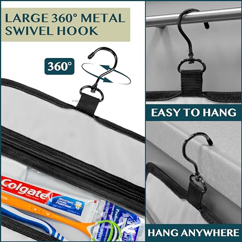• PADDED MAKE UP BAG KIT: The toiletry case bag for men has foam padding that protects toiletries container, shampoo bottle during flying, roadtrip, and plane. The toiletry bag kit also has elastic bands that secure makeup brush, face spray, lipstick, shaving razors. One waterproof compartment for wet toiletries. Clear pockets let you see all essentials clearly and is tsa approved. This large hanging toiletry bag holder for women will protect all gear, cosmetics, and travel gadgets.