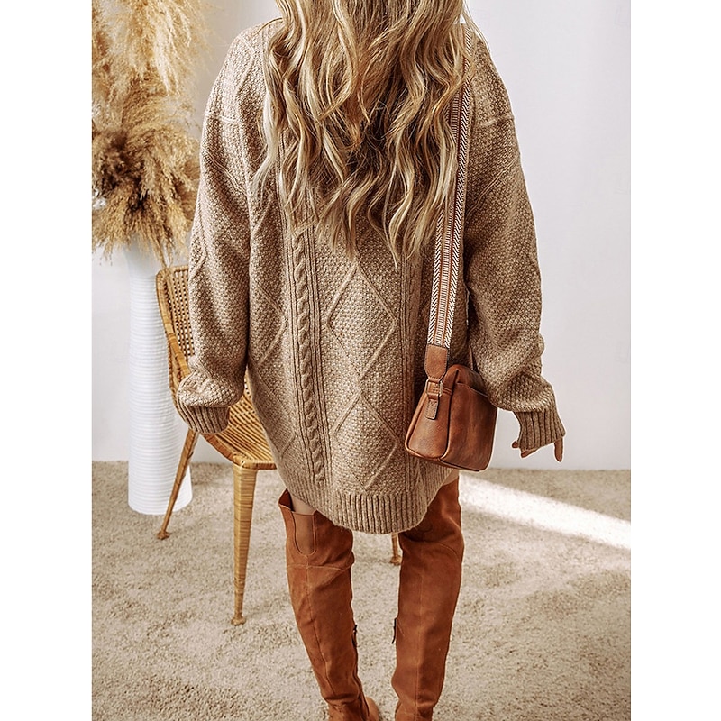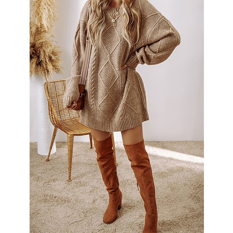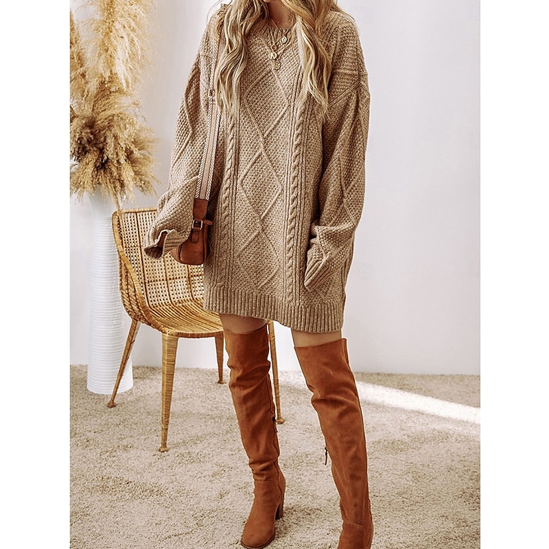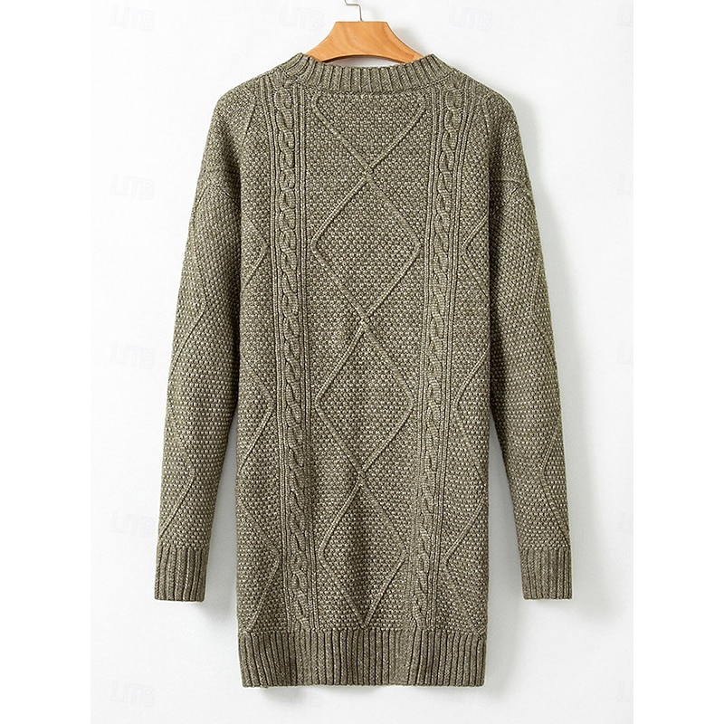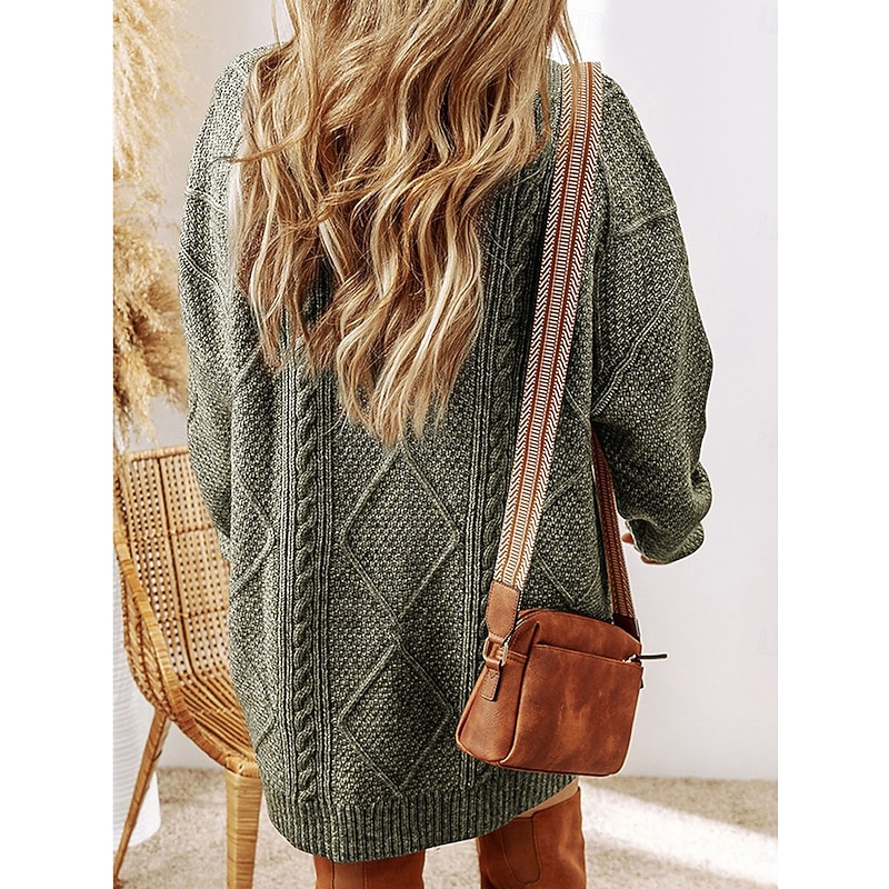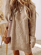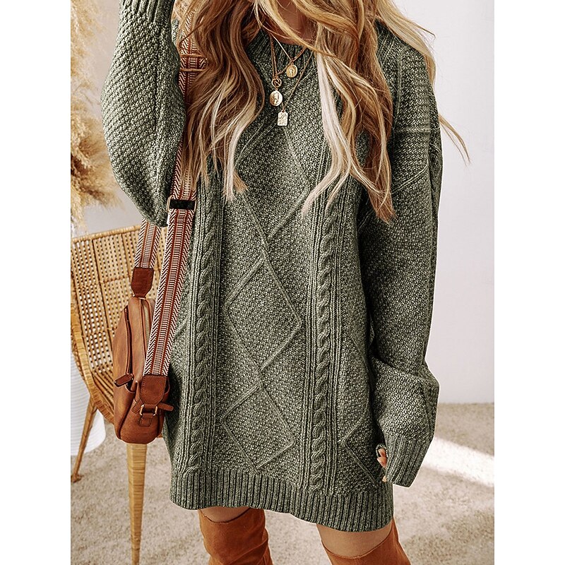 Highlights [Fabric] : Expertly crafted from a soft and durable polyester, this sweater dress offers both comfort and warmth, perfect for chilly fall and winter days. The fabric ensures a micro-elastic fit, accommodating ease of movement while maintaining its shape. [Fit] : Designed with a regular fit, this long sweater dress provides a relaxed yet sophisticated silhouette. Its long sleeves and crew neck deliver a vintage look with ribbed detailing at the cuffs, hem, and neckline to ensure a snug and cozy fit. [Design Highlights] : Featuring a timeless cable-knit style, this dress showcases intricate diamond and cable stitch patterns that add texture and depth. The pure color design makes it versatile and easy to style for any occasion, while the knitted material delivers a chic and elegant vibe. [Occasions] : Perfect for daily wear, outdoor activities, weekend outings, and casual gatherings, this sweater dress is an ideal choice for any setting where style and comfort are priorities. Pair it with jeans or leggings for an effortlessly chic ensemble. [Size Options] : Available in a variety of sizes ranging from S to XL, ensuring a suitable fit for a range of body types. The dress comes in multiple color options, including green, black, and khaki, allowing for personal style preferences. Perfect for everyday use. top-grade materials and excellent craftsmanship ensure long-lasting durability.