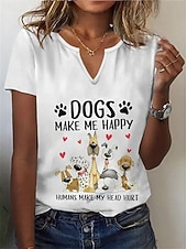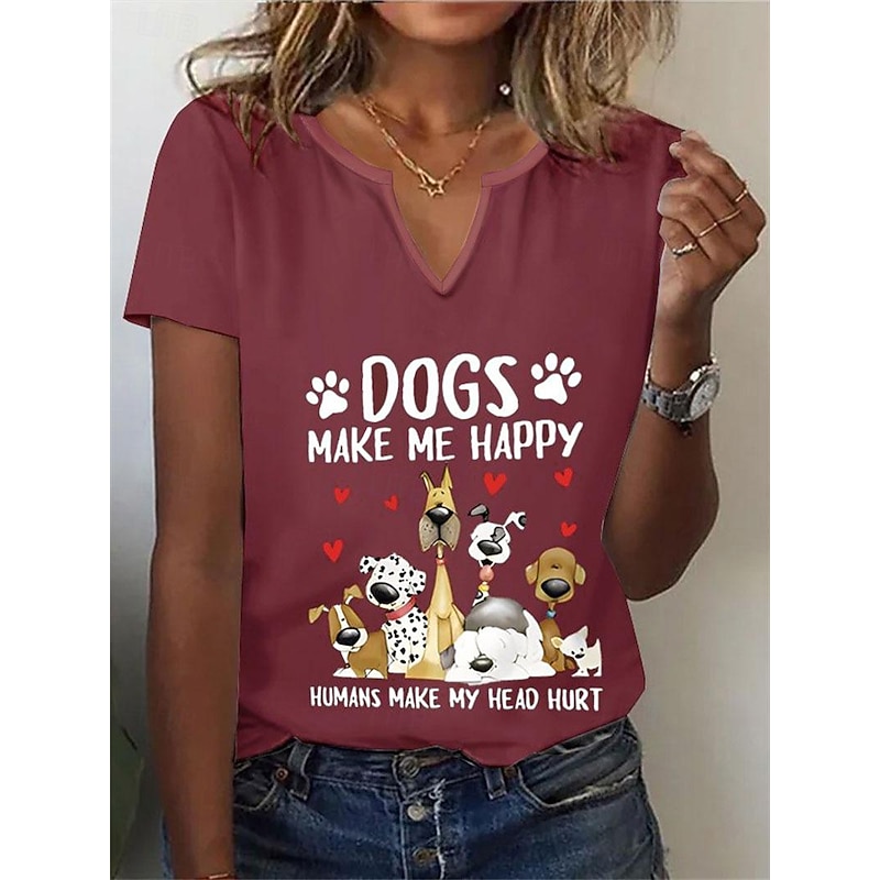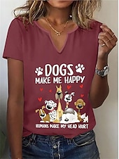 Highlights [Fabric & Fit:] Crafted from high-quality polyester, this women's T-shirt offers a soft, breathable feel with micro-elasticity for comfort and ease of movement. The classic short-sleeve, regular fit design makes it perfect for everyday wear. [Design Highlights:] Featuring a exclusive V-neckline, this T-shirt stands out with its playful dog and letter print. The cartoon illustrations of various dog breeds, along with the humorous text DOGS MAKE ME HAPPY, HUMANS MAKE MY HEAD HURT, add a fun and light-hearted touch, ideal for dog lovers. [Occasions:] Perfect for daily wear or relaxed weekend outings, this T-shirt pairs effortlessly with jeans or shorts for a laid-back, trendy look. Its style is versatile enough for casual gatherings or leisurely days. [Size Range:] Available in sizes S, M, L, XL, and 2XL, this T-shirt ensures a suitable fit for a variety of body types, offering a fashionable and comfortable choice for many. [Care Instructions:] Easy to maintain, this T-shirt can be machine washed or dry cleaned, ensuring convenience and longevity in your wardrobe. Perfect for everyday use. first-class materials and excellent craftsmanship ensure long-lasting durability.