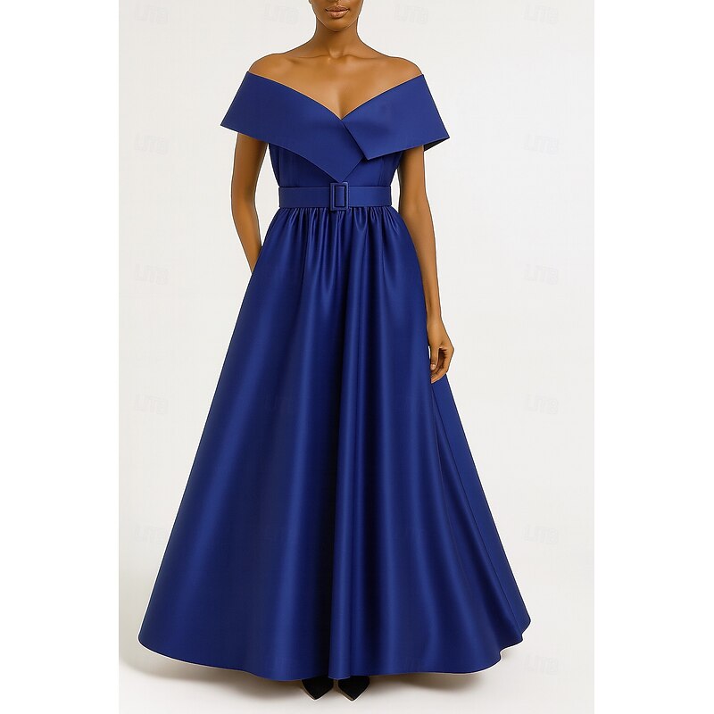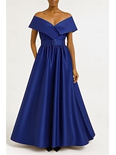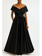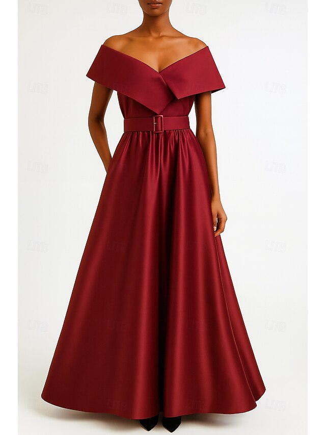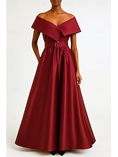 More information about Red Black A-Line Evening Gown Elegant Dress Formal Wedding Floor Length Short Sleeve Lapel Satin with Pleats 2025