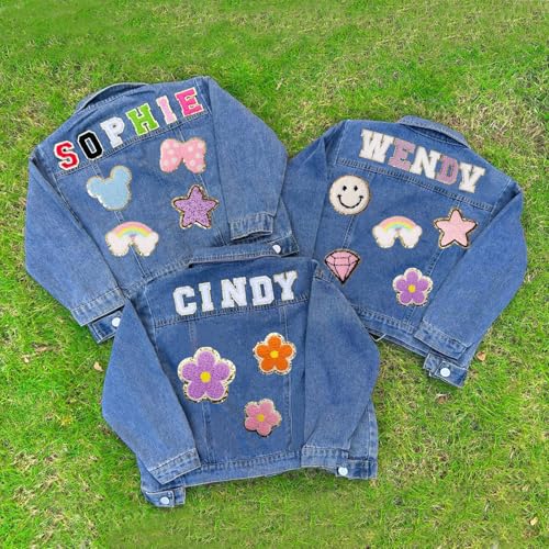 Personalized Kids Denim Jacket with Names, Cute Custom Chenille Letter Patch Children Denim Jacket for Girls Boys, Birthday Gift, Baby Denim Jacket, Christmas, Toddler Long Sleeve Jacket with Pattern