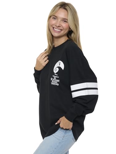 • OFFICIALLY LICENSED DISNEY JERSEY – This women's oversized long sleeve jersey sweatshirt features an iconic scene from Nightmare Before Christmas on the front, featuring silhouettes of both Jack and Sally. And on the back, puffy text that says "Jack Skellington" with his face right below, perfect for Disney fans!