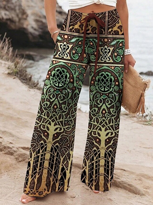 Women's Wide Leg Pants Trousers Vintage Ethnic Style Long High Waist Graphic Prints Elastic Waist Printing High Cut Breathability Soft Micro-elastic Vacation Street Daily Wear Red Blue Purple Green 9