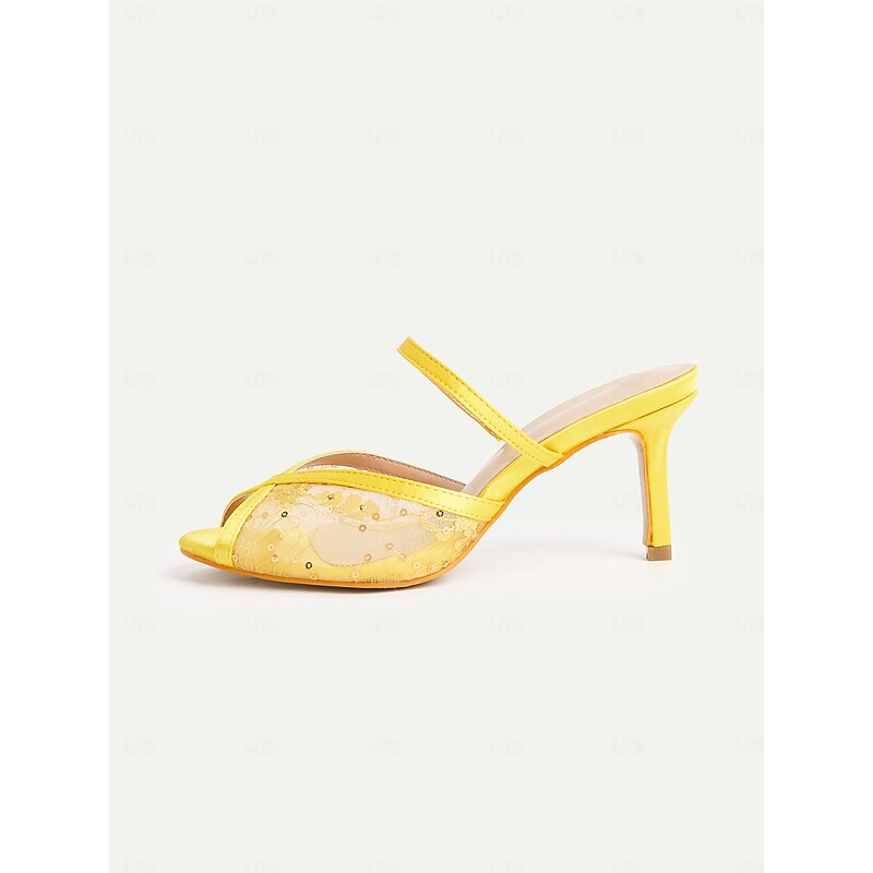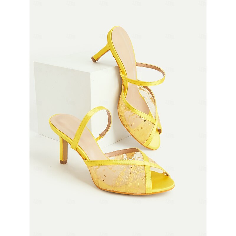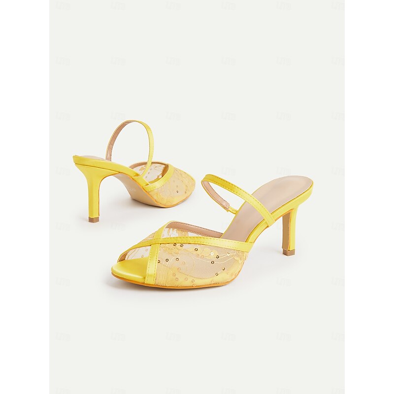sought-after ! Women's Yellow Mesh Stiletto Heel Sandals with Rhinestone Details – 1950s Elegant Open-Toe Heels for Summer Parties, Weddings, and Evening Events